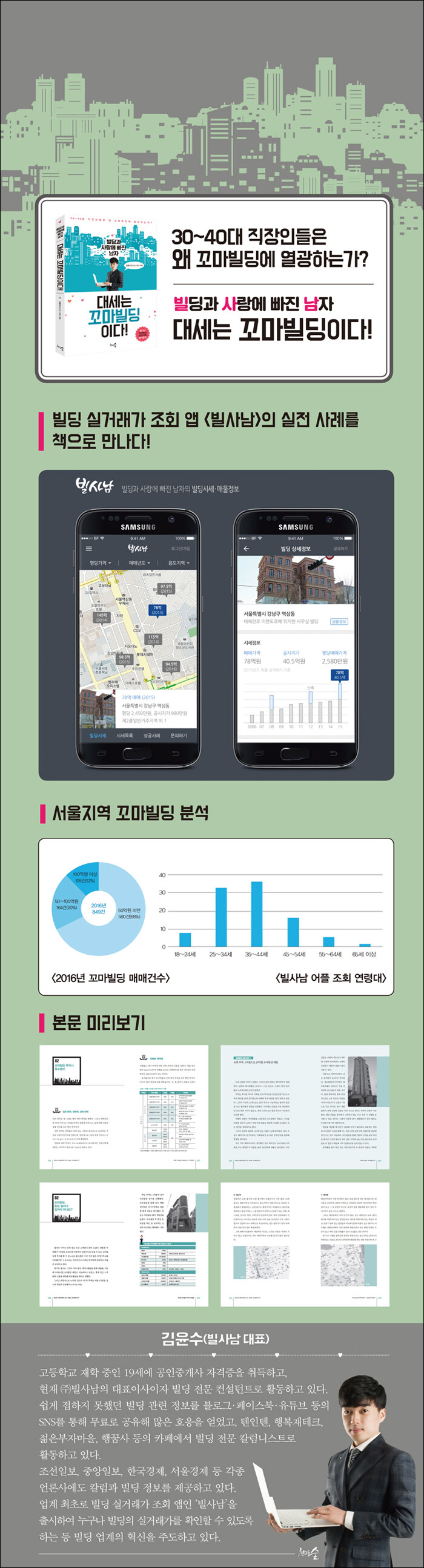 이 책은 꼬마빌딩에 관심이 있는 초보자들도 쉽게 읽을 수 있도록 어렵고 이론적인 내용보다는 꼭 알아야 할 실무적인 사례와 내용으로 구성했다. 특히 ㈜빌사남의 꼬마빌딩 실제 거래 사례를 통해 건물주가 되기까지 그들만의 생생한 스토리와 실제 임대수익 시세차익을 얼마나 얻었는지를 표로 한눈에 보기 쉽게 정리했다. 또한 빌딩 실거래가 조회 앱인 ‘빌사남’의 데이터를 통해 얻은 빌딩 매매건수, 지역, 매입 연령대, 대출비율 등을 분석하여 전체적인 빌딩 투자 트렌드를 전달하고 있다.