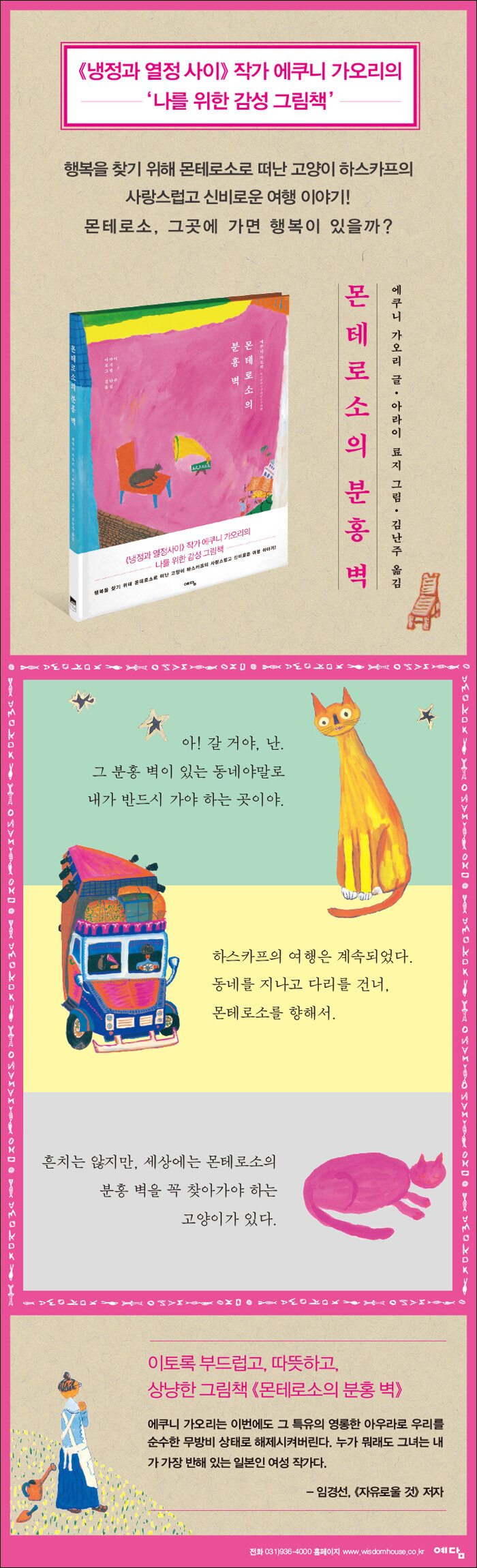 《몬테로소의 분홍 벽》에서는 몬테로소에 가면 행복해질 것이라며 과감하게 모험을 감행하는 고양이 하스카프의 이야기가 신비롭게 펼쳐진다. 그러나 하스카프처럼 자신이 가야 할 곳을 확신할 수 있는 자신감과 가진 것을 포기하고 떠날 수 있는 결단력을 갖기란 쉬운 일이 아니다. 그래서 뒤돌아보지 않고 씩씩하게 길을 나서는 이 용기 있는 고양이가 더욱 매력적일 수밖에 없다.