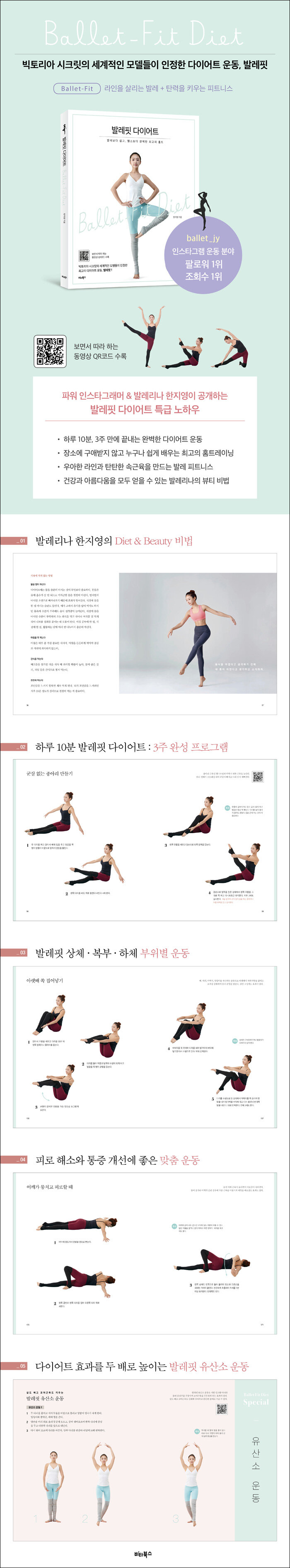 한 상체와 복부, 하체 라인을 위한 부위별 발레핏 운동을 소개하고 있어 내가 원하는 부위만 골라서 집중 관리할 수 있다. 더불어 여성들에게 쉽게 찾아오는 각종 증상과 통증에 좋은 맞춤 운동을 따로 소개해 평소 컨디션에 맞게 활용할 수 있도록 했다. 시연하는 영상을 보고 따라 할 수 있도록 동작마다 동영상 QR코드도 수록되었다.