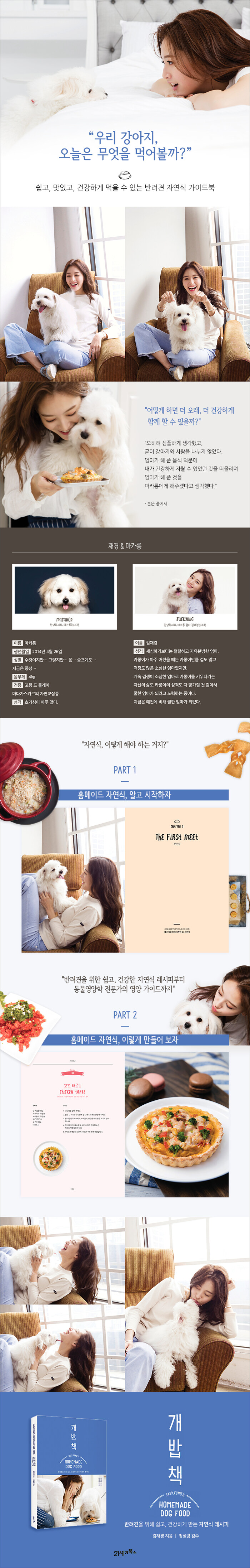 쉽고, 맛있고, 건강하게 먹을 수 있는 반려견 자연식 가이드북. 저자인 배우 겸 가수 김재경은 반려견과 행복한 시간을 오래 지속하고 싶다는 마음 하나로 자연식을 급여하기 시작했고, 그 마음은 여전히 현재진행형이다. '진짜 음식' 자연식은 영양소가 충분하고 사료에 비해 먹는 즐거움도 느낄 수 있다.