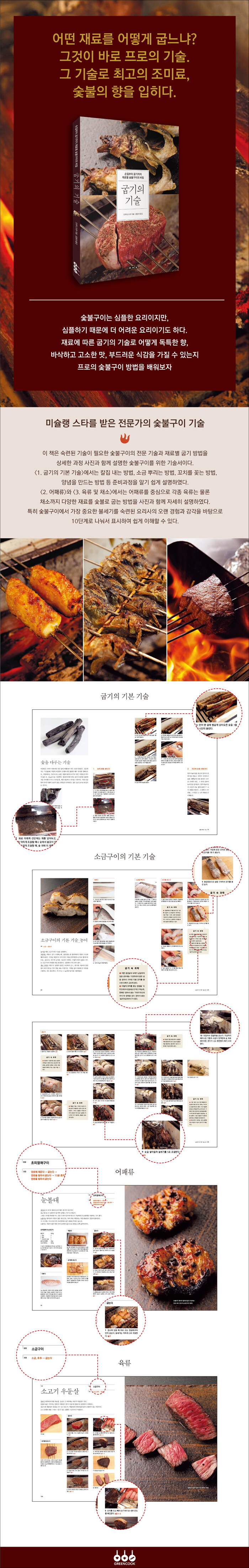 그 기술로 최고의 조미료, 숯불의 향을 입히다서양요리에서 구이는 프라이팬이나 오븐을 이용하여 간접적으로 굽는 것이 대부분이지만, 숯불구이는 프라이팬을 사용하지 않고 직접 굽는 직화구이이다. 프라이팬에 구울 때는 어떤 종류이든 오일을 사용하기 마련인데, 오일을 사용하면 재료에 오일의 맛이 더해지고 먹고 난 다음에도 입안에 오일의 맛이 남는다. 그에 비해 숯불구이는 어떠한 오일도 사용하지 않고, 재료에서 빠져나온 기름이 숯 위에 떨어져서 생기는 훈연향을 조미료 삼아 맛있는 구이를 완성한다. 이 책에서는 감각과 경험에 의존해온 숯불구이의 기술을 숙련된 요리사의 오랜 경험을 바탕으로 사진과 숫자로 알기 쉽게 설명하였다. 숯불구이에 필요한 기본적인 지식을 비롯하여 어패류와 육류 등 다양한 재료를 숯불로 굽는 기술을 현장감 가득한 과정 사진과 함께 자세히 설명하였고, 특히 각 재료마다 한 페이지 전체를 할애하여 방금 구워낸 재료의 생생한 모습을 담아 숯불구이의 매력을 제대로 전달해준다. 또한 숯불구이에서 가장 중요한 불세기를 아주 약한 불부터 가장 센 불까지 10단계로 나눠서 표시하여 쉽게 이해할 수 있게 하였다.