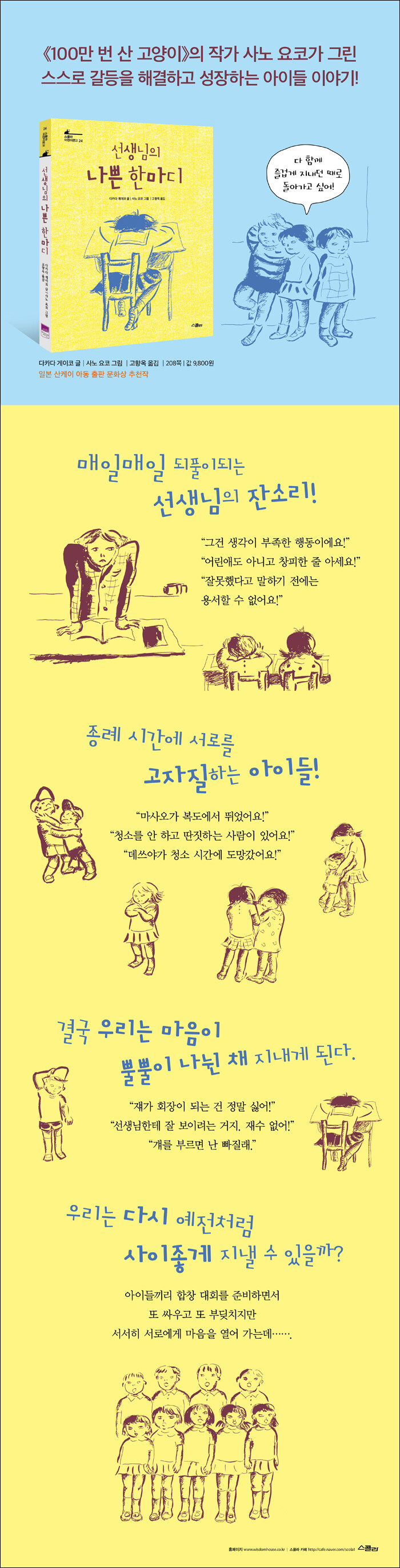 함께 힘을 모아 갈등을 해결하고 성장하는 아이들 이야기어린이가 공감하고, 다양한 생각과 마음을 나눌 수 있는 동화 시리즈 ‘스콜라 어린이문고’에서 스물네 번째 신간 《선생님의 나쁜 한마디》가 출간되었다. 이 책은 담임 선생님이 바뀌면서 학급 안에서 아이들이 겪는 관계의 변화와 갈등을 그린 작품으로, 아이들 힘만으로 갈등을 해결하고 성장하는 이야기가 담겨 있다. 인물들의 특징을 단순하면서도 강렬하게 담아낸 사노 요코의 그림이 책 읽는 즐거움을 더해 준다.
