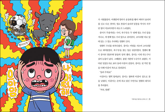 풍이는 두룽마을에 사는 소년이다. 풍이가 생각하기에 세상에서 가장 힘든 일은 두룽마을 어린이로 사는 것이다. 아이들을 괴롭히는 세 명의 적이 있기 때문이다. 바로 난폭한 미친 염소, 염맨. 스프링 노트를 항상 옆구리에 끼고 다니며 비밀스럽게 마을 아이들을 지켜보는 도아리 누나 그리고 걸핏하면 아이들을 혼내는 어른들이다. 풍이는 운동화를 더럽혀 오면 늘 엄마의 뒤집개로 위협 당한다.