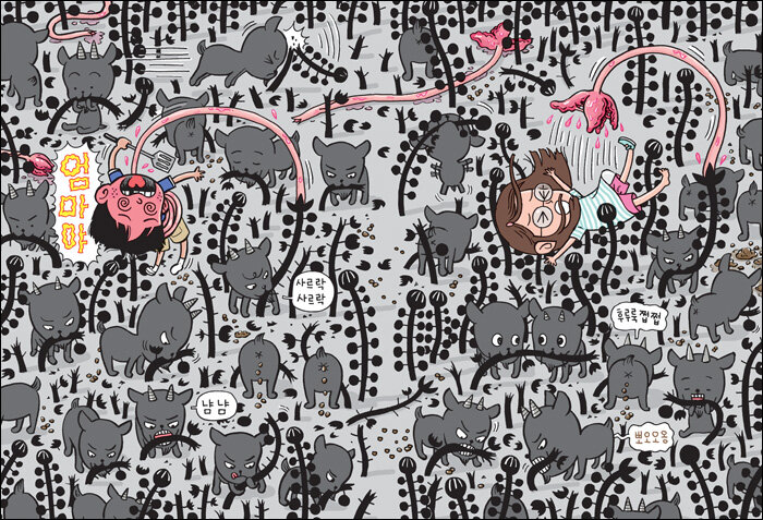 글과 그림의 절묘한 조화! 이 한 치 앞을 알 수 없는 이야기는 조경규 작가의 그림으로 더욱 빛을 발한다. 언뜻 만화 속 주인공처럼 보이는 인물들은 표정과 몸짓이 살아 있고 유머러스하게 표현되었다. 분홍 촉수를 내미는 인간만 골라골라 풀 역시 재미있게 표현되어, 인간을 공격하는 장면에서도 실소를 터트리게 만든다. 사람들을 도와주는 조력자로 나오는 가축 동물들도 깜찍하다. 특히 주인공이라고 할 수 있는 미친 염소, 염맨은 거친 말투와 난폭한 성미가 그림 속에 생생하게 표현되어 있다.