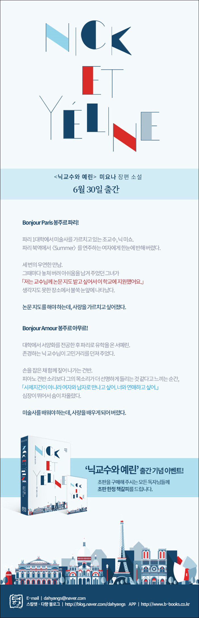 미요나 작가의 <닉교수와 예린>이 9년 만에 새로운 모습으로 재출간되었다. 낭만적인 프랑스 파리를 배경으로 미술사를 배우기 위해 유학을 온 예린과 그녀의 지도 교수 닉의 사랑 이야기를 담고 있는 이 작품은 눈앞에 프랑스 정경이 그려지는 듯한 그림 같은 묘사와 유학생으로서 겪는 어려움, 국제 커플이 갖는 고민을 현실감 있게 풀어내 많은 사랑을 받았다. 2017년 출간되는 개정판에서는 더욱더 섬세하게 다듬어진 두 사람의 감정선과 새롭게 추가된 에피소드가 다시금 강력한 설렘을 선사할 것이다.