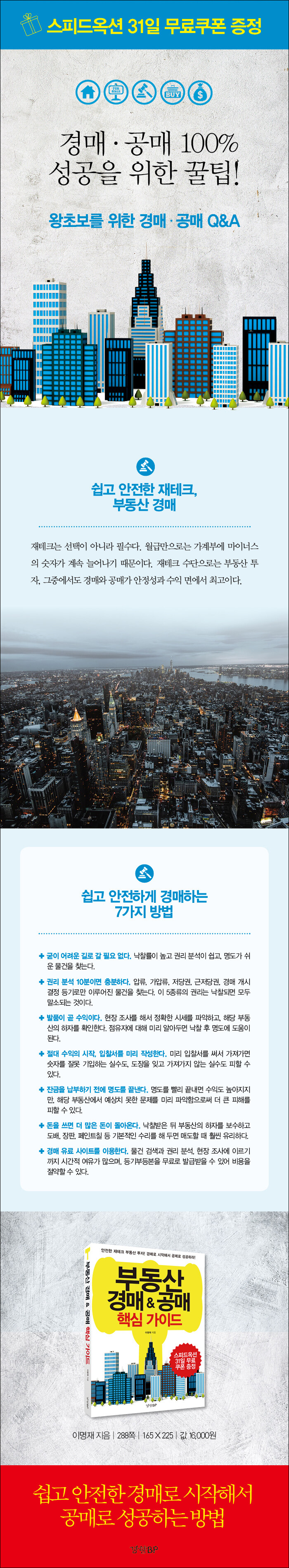 이 책에서 저자는 경매에서 꼭 알아야 할 부분들을 자신이 직접 경험한 다양한 경매 사례들을 통해 설명하여 왕초보라도 쉽게 경매를 이해할 수 있다. 낙찰률을 높이는 물건 선정법, 귄리 분석하는 법, 입찰 금액 정하는 법, 명도를 쉽게 하는 방법, 매도를 빨리 하는 요령 등 경매의 시작부터 마무리까지 전 과정을 세세하게 가르쳐 줄 뿐만 아니라 경매에 꼭 필요한 법률적인 부분까지 알려 준다.