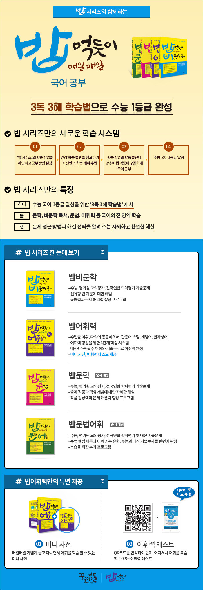 '학생들에게는 국어 능력을 향상시켜주는 최고의 책, 선생님들에겐 알찬 수업이 되게 하는 최적의 학습 도구'를 만들자는 생각으로 20여 년간 국어 학습서 문제집을 집필하고 제작하여왔다.매년 10만 이상의 고등학생들이 사용하던 <꿈틀 국어 상.하>를 비롯하여 <모든 것 시리즈>, <첫 수능 시리즈>, <심쿵 명강 시리즈>, <국어는 꿈틀 시리즈>, <완성 시리즈>, <문학 비책> 등이 초심을 지키며 만들어낸 결과물로 학생들과 선생님들에게 많은 사랑을 받고 있다. 특히, 교재 집필을 하며 도움과 관심이 필요한 곳을 찾아 사회 환원 활동을 하자는 뜻을 함께한 공동 집필자들을 만난 것은 인생의 기쁨이 아닐 수 없다. 이런 마음이 모여 집필을 하였기 때문에 더 좋은 책을 만들 수 있지 않았나 싶다.<밥비><밥어휘력><밥문학><밥문법 어휘><예비 밥시리즈>는 매일매일 개별 학습자의 능력에 맞게 <학습 플랜>을 짜고 [제대로 독해법]과 [제대로 풀이법]으로 기출을 학습할 수 있게 되어 있다. 수능 국어가 유형화된 지문과 문제를 정해진 시간에 정확히 독해하고 해결하는 능력을 평가하는 쪽으로 변화하여 왔기 때문에 <밥 시리즈>는 변화된 수능 국어에 가장 알맞은 수능 기출 학습 교재라고 할 수 있다.앞으로도 학생들과 선생님들에게 꼭 필요한 교재를 만드는 일에 초심을 지키며 힘을 다해나갈 것이다.