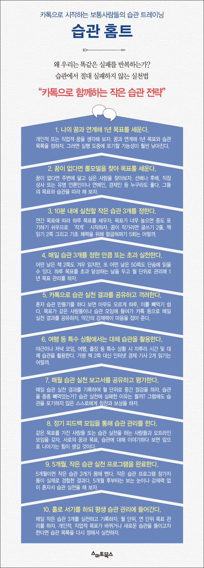 -카톡으로 함께하는 작은 습관 전략그러면 어떤 습관을 어떻게 들여야 할까? 우리는 매년 ‘올해 목표는 금연이다’, ‘결단코 다이어트다’, ‘영어 회화 마스터다’를 외치지만, 대부분 작심삼일이다. 1개월 혹은 3개월 고비를 넘기지 못한다. 어린 시절부터 거듭된 습관(새해 다짐) 실패의 경험은, 언제부턴가 습관을 ‘말이 쉽지, 사실은 어려운 것’이라며 멀리하게 해 버렸다.