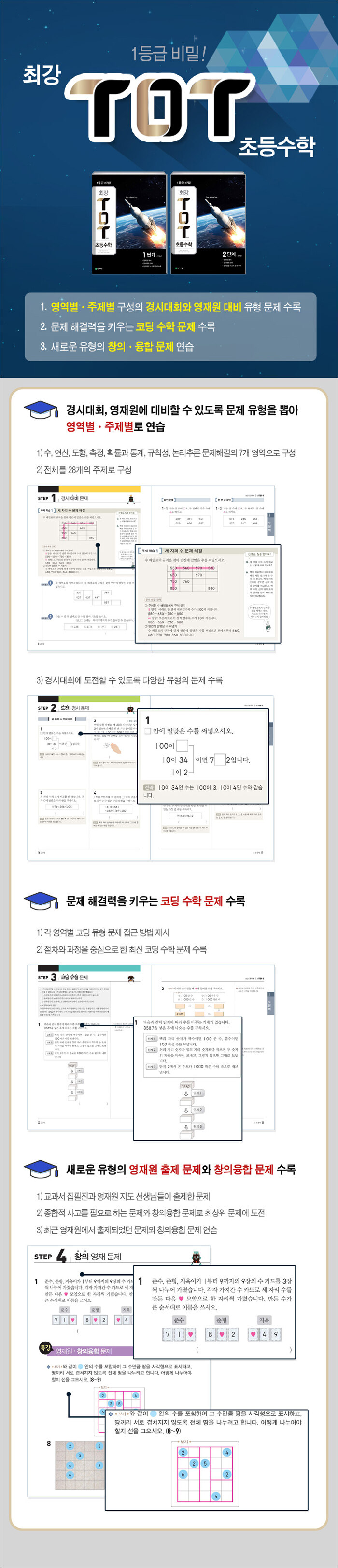 영재원 대비 또는 경시대회 대비로 만들어진 새로운 수학 교재다. 새 교육과정에 맞는 새로운 유형의 문제들인 창의융합 문제와 코딩 유형 문제 등 다양한 문제를 풀어보고 연습할 수 있다. 새로운 코딩 문제들은 모든 컴퓨터적인 사고체계를 뜻하며 이러한 사고 기반을 이용한 수학 문제들은 문제 해결을 위한 절차와 과정, 조합을 통해 오류를 줄여가는 연습이라고 할 수 있다.