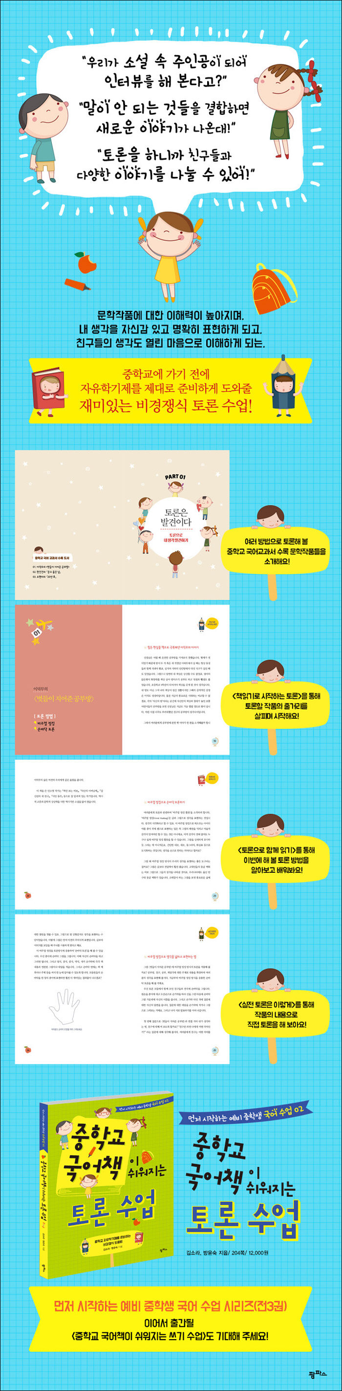 '먼저 시작하는 예비 중학생 국어 수업 시리즈'는 중학교 국어 교과의 기본 구성인 ‘읽기, 쓰기, 듣기, 말하기’ 중에서 ‘읽기, 토론하기, 쓰기’를 다루고 있습니다. 이번에 출간된 시리즈의 두 번째 책인 《중학교 국어책이 쉬워지는 토론 수업》은 중학교 국어 교과서에 수록된 문학작품들의 내용에 대해 다양한 방식의 토론으로 접근하여 이해력을 높이는 책입니다. 문학작품에 대한 다양한 사고법을 키울 수 있을 뿐만 아니라, 각 문학작품마다 적용해 볼 수 있는 여러 토론기법에 대해서도 알아보며 직접토론해보는 기회도 가질 수 있습니다. 문학작품의 주제와 작가의 의도 찾기에만 집중하는 독서가 아닌, 다양한 시각으로 접근하며 내 생각에 대해 자유롭게 이야기하고 친구들과 의견을 주고받을 수 있는 방법을 알 수 있습니다. 무엇보다 중학교에 올라가면 접하게 될 ‘자유학기제’에 대비하기 위해, 활동 중 하나인 독서 동아리에서 활용하기 좋은 수업이 되어줄 것입니다. 중학교 교과를 놓치지 않으면서 한결 더 자유롭고 깊이 있는, 폭 넓은 사고를 할 수 있어 예비 중학생인 초등생뿐만 아니라 교과서가 어려운 중학생들에게도 도움이 될 책입니다.