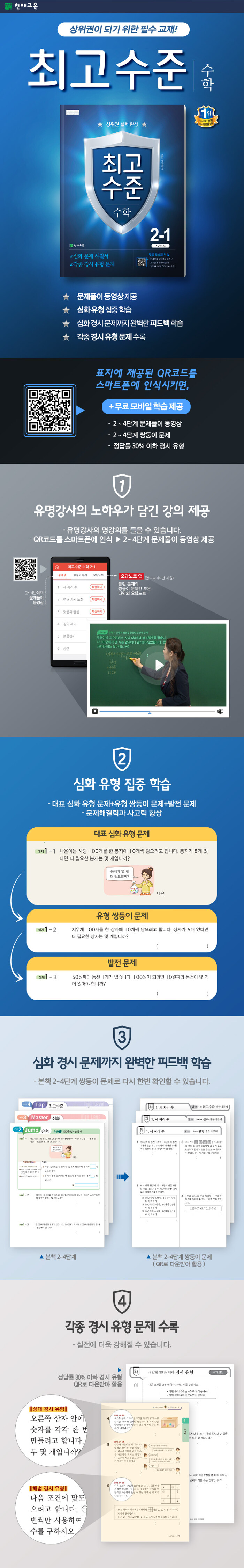 심화 문제부터 교내외 경시대회 준비까지 최고수준 수학으로 상위권 실력을 완성할 수 있다. 표지에 제공된 QR코드를 인식시키면 2~4단계 문제풀이 동영상, 2~4단계 쌍둥이 문제, 정답률 30% 이하 경시 유형 문제를 제공한다. 심화 유형 문제와 발전 문제를 통해 문제해결력을 키울 수 있으며, 통합교과 문제, 창의.융합 문제, 각종 경시유형 문제를 수록하여, 좀 더 확장된 창의 사고력을 키울 수 있다.