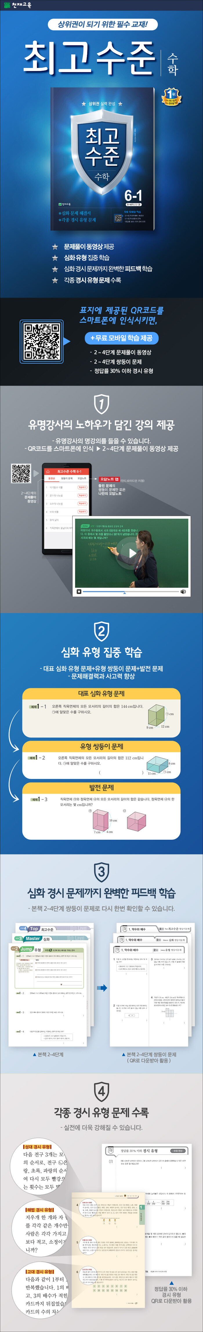 -표지에 제공된 QR코드를 인식시키면 2~4단계 문제풀이 동영상, 2~4단계 쌍둥이 문제, 정답률 30% 이하 경시 유형 문제를 제공합니다.