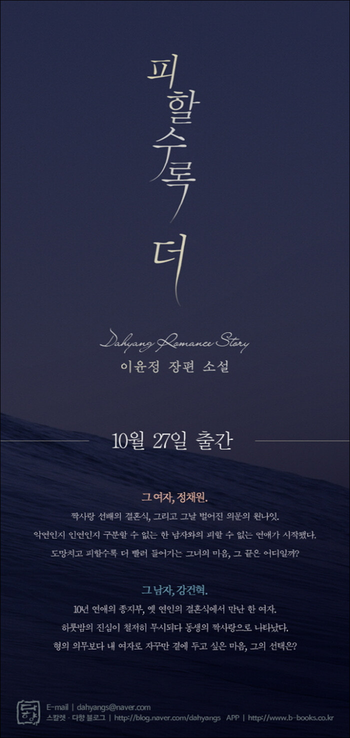 이윤정 장편소설. 그 여자, 정채원. 짝사랑 선배의 결혼식, 그리고 그날 벌어진 의문의 원나잇. 악연인지 인연인지 구분할 수 없는 한 남자와의 피할 수 없는 연애가 시작됐다. 도망치고 피할수록 더 빨려 들어가는 그녀의 마음, 그 끝은 어디일까? 그 남자, 강건혁. 10년 연애의 종지부, 옛 연인의 결혼식에서 만난 한 여자. 하룻밤의 진심이 철저히 무시되다 동생의 짝사랑으로 나타났다. 형의 의무보다 내 여자로 자꾸만 곁에 두고 싶은 마음, 그의 선택은?