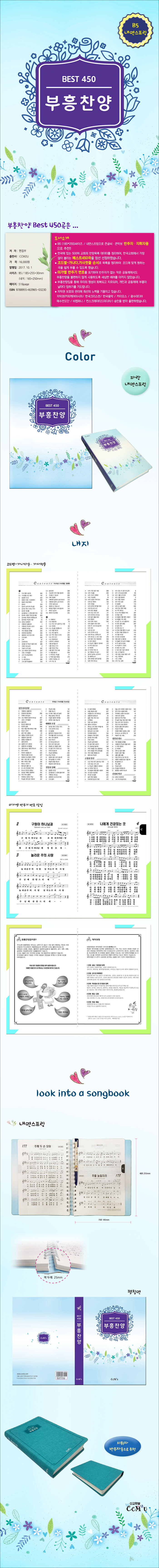내면스프링으로 큰글씨. 큰악보로 반주자. 지휘자용으로 추천하는 찬양곡. 전국에 있는 500여 교회의 찬양목록 데이터를 정리하여, 한국교회에서 가장 많이 불리는 베스트450곡을 엄선 선정하였다. 가나다. 가사첫줄 순서로 목록을 정리하여 코드에 맞게 원하는 곡을 쉽게 부를 수 있도록 했다.