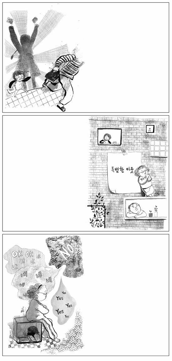 특별한 이웃은 이래라저래라 간섭하면서 깊이 상관하기보다 상대방을 인정하고 존중하며 응원하는 사람입니다. 저는 부모와 자식, 남편과 아내, 친구와 친구, 작가와 등장인물 등 모든 관계가 이렇듯 특별한 이웃이 되면 좋겠다고 생각합니다. - 글쓴이의 말 중에서