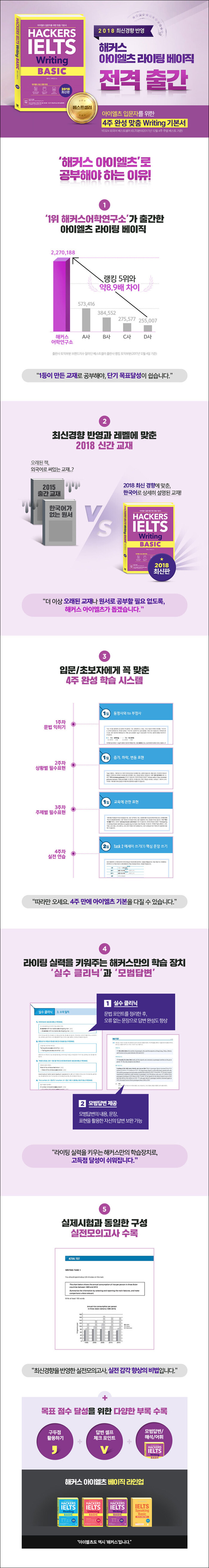 최신 경향을 반영한 2018 최신판! <Hackers IELTS Writing Basic>과 함께 하면 아이엘츠 기본기부터 탄탄히 하고 최신 경향에 완벽 대비해 목표 점수를 달성할 수 있습니다.