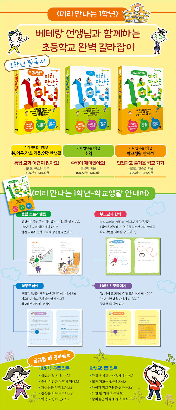 첫 번째 '부모님과 함께'는 아이와 부모님이 함께 체험하며 직접 그리고, 생각하고, 말하고, 써 보면서 재미있게 학교와 친해질 수 있다. 두 번째 '학부모님께'는 학교생활에 대한 사소하면서도 구체적인 알짜 정보를 모두 담았다. 등하교 지도를 어떻게 해야 하는지, 교통 지도는 필수인지, 준비물을 어떻게 챙겨 줘야 하는지 궁금할 때 찾아볼 수 있게 했다.