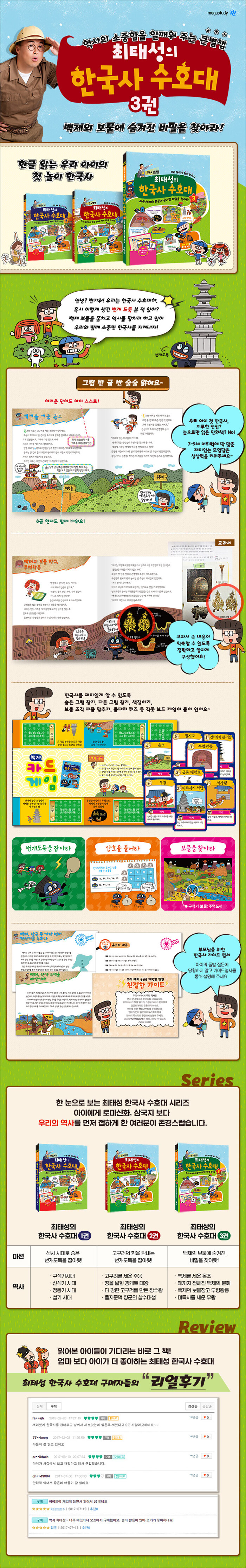 20년 동안 500만 학생들의 한국사를 책임져 온 큰별★쌤 최태성 선생님이 신나게 놀면서 제대로 배우는 한국사 학습법을 공개한다. 우리 아이들의 역사적 상상력을 키워 줄 흥미진진한 탐정 스토리로 한국사를 풀어냈다. 숨은 그림 찾기, 다른 그림 찾기, 색칠하기, 보물 조각 퍼즐 맞추기, 돌다리 퀴즈 등 각종 보드 게임을 더하였다. 아이들의 질문에 막힘없이 대답해 줄 엄마표 가이드 엽서를 담았고, 8급 한자도 함께 배울 수 있다.