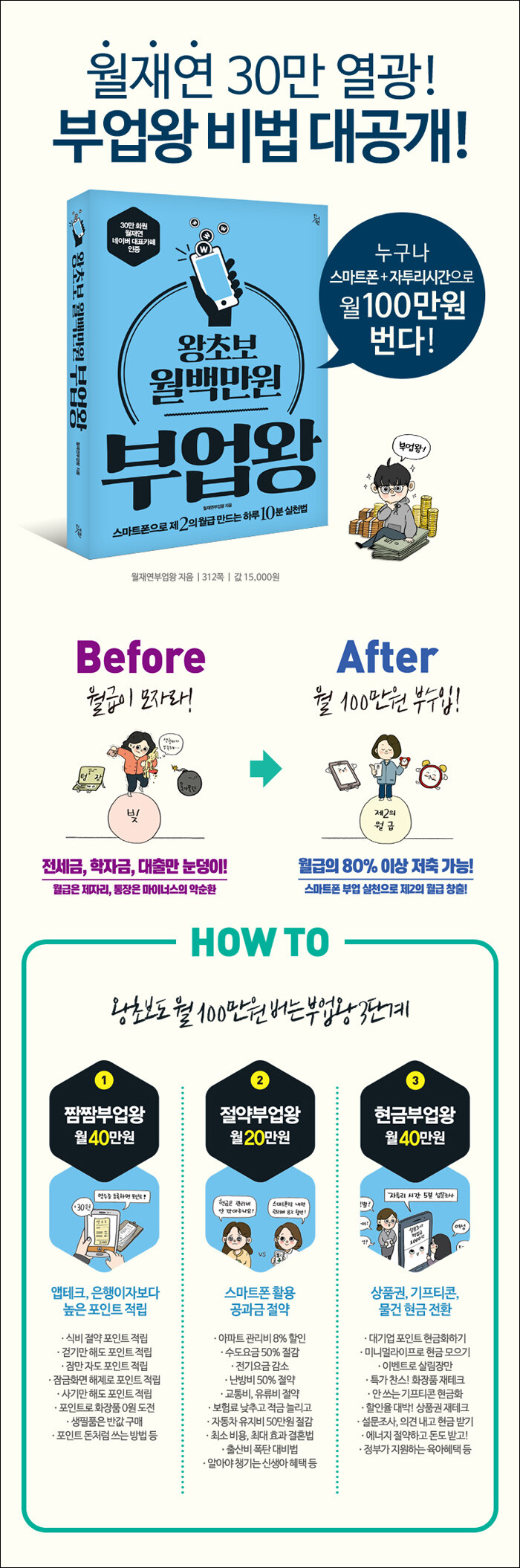 월재연부업왕 13인르다엘님 좋아하는 취미를 즐기면서 그 취미로 수입까지 창출한다면 더 즐거운 취미생활이 아닐까 합니다. 이 책에는 누구나 할 수 있는 부업이 많지만, 취미를 통해 자신만의 부업을 찾아보는 건 어떨까요?강공쥬님 월재연 카페를 만나고 부업을 하면서 돈을 대하는 마음이 달라졌습니다. 같은 금액의 돈을 가치 있게, 현명하게 쓰는 법을 생각하게 되었고, 돈이 많고 적음을 떠나 더 행복 하고 즐겁게 사는 방법을 알게 되었어요. 그 과정에서 항상 도와주는 가족에게 늘 감사합니다. 부자로한걸음님 갑작스런 휴직으로 막막했지만 천천히, 그리고 꾸준히 하는 마음이 빛을 발한 것 같습니다. 여러분도 자신의 재능을 살려 잘할 수 있는 분야에 도전하고, 꾸준히 성실한 마음만 가진다면 분명 모든 부업에서 좋은 결실을 맺을 수 있을 겁니다.까탈쑥이님 맞벌이 부부에서 외벌이 전환, 거기에 임신과 출산까지! 집에서 아이를 키우면서도 외벌이 남편의 부담이 클까 걱정되어 시작한 부업! 처음엔 집안 살림이나 기저귀값 정도 버는 능력을 키워보자는 생각으로 시작했는데, 덕분에 지금은 신랑이 주는 생활비를 몽땅 적금으로 넣고 있어요~ 잘살아보고싶다님 아이 셋 키우며 정신없이 사느라 은행금리도 신경 안 쓰던 제가 월재연 카페를 만나 이제는 은행 문턱이 닳도록 드나들고, 앱테크 부업으로 살림까지 책임지게 되었어요. 이렇게 달라진 저처럼 여러분도 달라질 수 있습니다.꼬꼬빠님 ‘언제 모아서 쓰지?’ 하는 생각으로 시작한 부업, 어느덧 푼돈이 목돈이 되어 내게 맞는 방법으로 관리까지 하게 되었네요. 저도 성공했으니 이 책을 보는 모든 분도 할 수 있습니다! 무작정 따라하지 말고 꼭 나만의 스타일을 만들어 부업에 도전하시기 바랍니다. 파이팅!절약지존님 결혼 초 아들 맡길 곳이 없어 시작하게 된 외벌이 생활. 절약할 방법을 찾으며 아들 과자값이라도 보태려고 시작한 부업이 이제는 1년 생활비도 거뜬하네요. 외벌이 15년차 남편, 남들보다 일찍 은퇴시켜주고픈 마음에 오늘도 열심히 부업을 합니다.꽃빈님 처음엔 외벌이로 비상금 조금 모으는 것조차 버거워 월재연 카페에 가입했지만, 지금은 재테크 정보나 규모, 부수입 액수를 떠나 카페에서 만난 좋은 친구, 언니들과 즐겁게 부업을 하고 있어요. 함께 가는 부업 메이트가 있다는 건 정말 중요한 것 같아요.집밥의여왕님 이유식, 처음에는 막막했는데 부업과 약간의 계획으로 아이에게 사랑, 건강, 적금까지 선물할 수 있었어요. 여러 이유로 부업을 망설이는 분들도 용기를 가지고 도전해보셨으면 좋겠습니다.나노아님 애 낳으면 돈 못 모은다? No! 애 낳고도 충분히 절약하며 돈을 모을 수 있어요. 조급하게 생각하지 말고 마음의 여유를 가지고 차근차근 자신이 할 수 있는 범위 내에서 부업을 해보세요. 마음만 잘 다잡으면 뭐든 할 수 있습니다.풀잎먹는깨미님 부득이 외벌이가 되고 힘들 줄 알았는데 오히려 푼돈의 소중함과 절약의 즐거움을 느끼게 되었어요. 그러니 긍정적인 마음은 자연스럽게 따라오더라고요. 돈을 쫓기보다 마음의 부자가 되었으면 좋겠습니다.똘똘새댁님 어려운 상황에서 만난 월재연 카페에서 마음을 다잡고 매일매일 하나씩 배우고 익힌 덕분에 그때의 위기가 지금은 기회가 되었습니다! 제가 그런 것처럼 이 책에 담긴 내용이 많은 분들에게 희망이 되길 바랍니다.하늘별땅님 결혼을 통해 두 사람이 만나 한 살림을 차리게 되면서, 알뜰살뜰 모아 좀더 빠른 내집 마련을 해보겠다는 목표 하나로 아끼며 열심히 모으고 있어요. 올해도 결실을 맺기 위해 파이팅하고 있습니다. 여러분도 목표를 가지고 파이팅하길 바라요.
