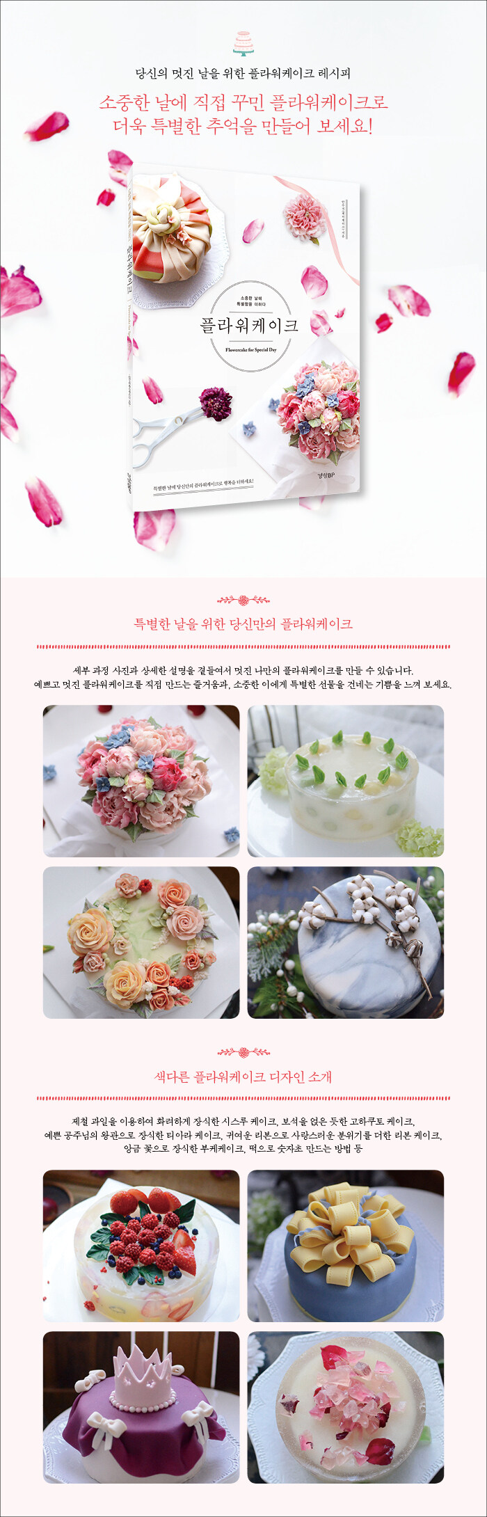 제철 과일을 이용하여 화려하게 장식한 시스루 케이크, 보석을 얹은 듯한 고하쿠토 케이크, 천연의 고운 색을 넣어 한국 전통미가 있는 보자기 케이크, 우아한 자리에 어울리는 예쁜 대리석 무늬의 마블 커버링 케이크, 예쁜 공주님의 왕관으로 장식한 티아라 케이크, 귀여운 리본으로 사랑스러운 분위기를 더한 리본 케이크, 앙금 꽃으로 장식한 부케케이크, 떡으로 숫자초 만드는 방법 등 아름답고 개성 있는 플라워케이크 레시피를 담았다.