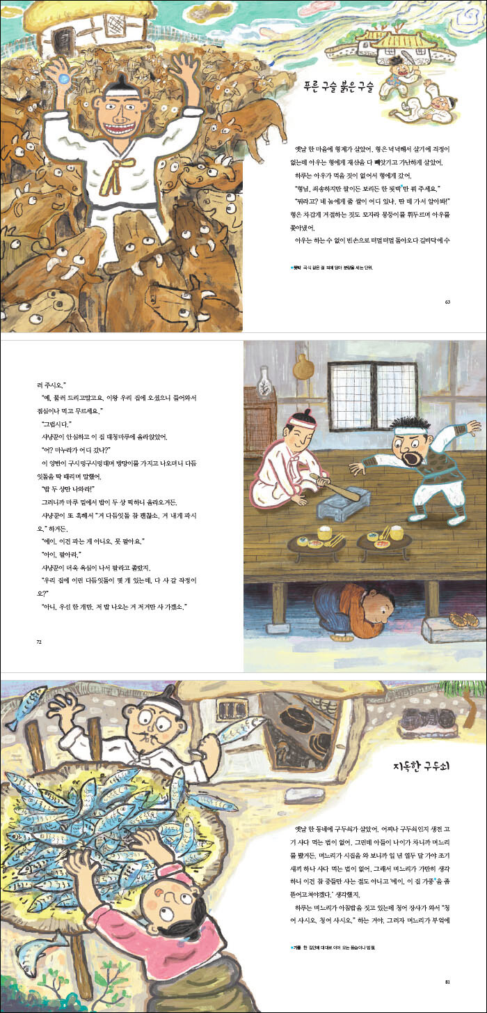 마지막으로 〈지독한 구두쇠〉〈자린꼽쟁이〉〈충주 자린고비가 떡 해 먹다가〉는 재물에 대한 욕심이 일상생활 전체에 배어 있는 사람들의 이야기입니다. 재물을 아껴야 맞겠지만 정도가 지나치면 재물의 노예가 될 수 있음을 알려줍니다.