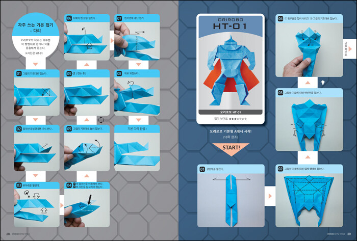 전작이 많은 종이접기 마니아에게 사랑받은 이유는 수록 작품들이 매우 정교해 실제 프라모델과 흡사한 로봇 형태를 갖추고 있어서다. 그만큼 난이도도 있어 종이접기 초보자보다는 ‘나 종이 좀 접는다’고 하는 종이접기 마니아들은 더욱 오리로보 접기에 열광했고, 도전했고, 또 즐겼다. 디자이너인 작가가 직접 디자인한 이 책에는 접기 설명을 사진과 도면으로 처리해 보다 명확한 이해를 돕는다.