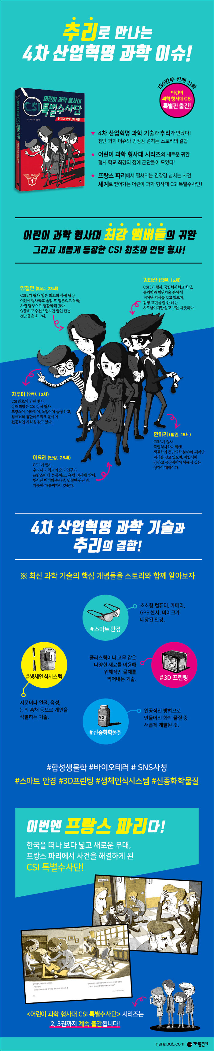 4차 산업혁명 과학 기술과 추리가 만났다! 최근 3D프린팅, 빅데이터, 사물인터넷(IoT) 등 제4차 산업혁명의 과학 기술은 우리 생활 가까이 성큼 다가와 있습니다. <어린이 과학 형사대 CSI 특별수사단>에서는 최신 과학 이슈들과 긴장감 넘치는 사건들이 결합돼 우리 생활에 첨단 과학이 어떻게 활용되고 있는지, 핵심 개념들을 스토리와 함께 자연스럽게 익힐 수 있습니다. 뉴스로만 접하던 제4차 산업혁명 과학 기술의 주요 개념을 추리를 통해 재미있게 익히고, 사건을 해결하면서 첨단 과학 기술이 실생활에 어떻게 연계돼 있는지 알아갑니다.