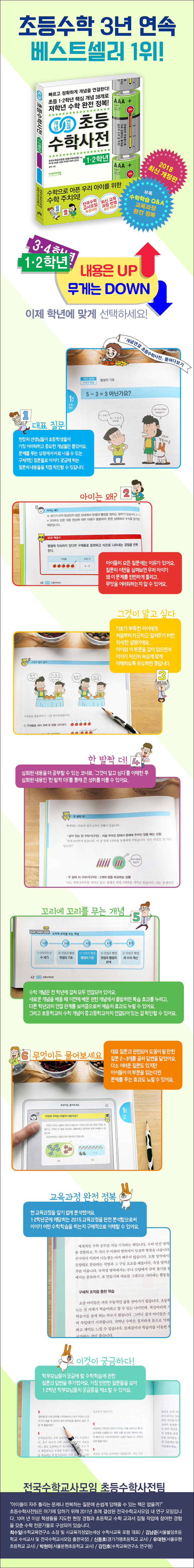 ● 새로 바뀐 교육과정이 반영된 2018 최신 수학사전새 교과서에 맞는 최신 수학사전으로 공부하세요! 지난 2017년, 1·2학년 수학 교과서의 단원, 단원명, 내용이 새롭게 바뀌었습니다. 『개념연결 초등수학사전 1·2학년』은 새로 적용된 교육과정에 맞춰 제작되었습니다. 새 교과서로 공부하면서 궁금한 내용이 생기더라도 예전 교과서를 찾아볼 필요가 없습니다. 새롭게 바뀐 단원명에 맞게 제작된 『개념연결 초등수학사전 1·2학년』에서 바로바로 궁금한 점을 찾아보세요.