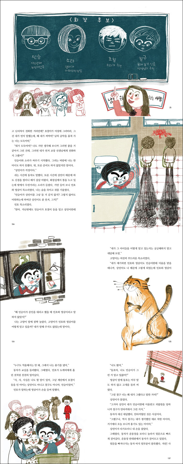 어디선가 갑자기 나타난 고양이가 하는 말이, 언제까지 다른 사람 일에 관심 없이 살 거냐면서, 엄마도 친구들도 무시하는 것 같아 기분이 상한 철구의 마음을 부추깁니다. 회장이 되고 싶은 마음은 눈곱만큼도 없었지만, 다른 세 후보를 보고 있자니 철구도 은근 회장이 하고 싶은 마음이 듭니다. 그리고 언제나 단짝인 동자도 철구를 응원하고요. 담벼락에 앉아 자신이 하는 말을 잘 들으면 회장이 될 수 있다고 말하는 고양이와 그 말에 혹하게 되는 철구의 모습에서 우리는 두 번째 의문이 듭니다.