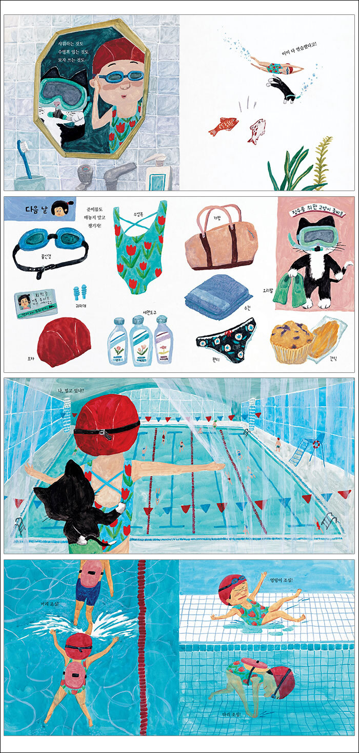 맑은 물감으로 채색된 시원한 그림 속에는 이렇듯 ‘고양이가 들려주는 또 다른 수영 이야기’가 숨겨져 있습니다. 짝이 되어 든든하게 곁을 지켜 주면서도 좌충우돌 기막힌 재미를 선사하는 고양이 덕분에 독자는 흥미를 잃지 않고 이야기에 집중할 수 있지요.