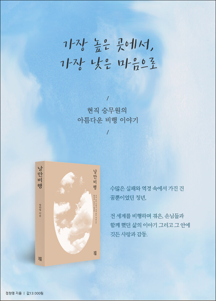 새로운 꿈과 낭만을 향해 또 한발을 딛다 꿈의 성취는 자연스레 그의 다음 보폭을 잇게 만들었다. 승무원으로서 보낸 3년여 낭만비행의 시간을 통해 저자는 또 다른 목표를 갖고 꿈을 꾸기 시작했다. 그중 첫 번째는 책을 쓰는 일이었고, 승무원이 되고자 노력하고 방법을 고민하는 수많은 젊은 친구들에게 자신의 이야기를 실질적인 조언 삼아 들려주고 싶었다. 그리고 두 번째는 이제껏 꾸준히 해왔던 봉사활동을 한층 구체적으로 진행해보고 싶다는 바람이다. 나와 타인이 함께 현실을 극복해 나가자는 마음에서 시작한 봉사활동은 이미 그의 생활 일부가 된지 오래다. 매해 겨울 연탄봉사와 보육원 봉사, 유기견 봉사, 그리고 아시아 3대 빈민촌인 쓰레기마을을 비롯한 해외봉사 등등. 저자는 가장 높은 곳에서 비행의 자유와 낭만을 즐기면 즐길수록 가장 낮은 곳에서 벌어지는 수많은 시련과 좌절에 관심 갖고, 작게나마 힘이 되어주고자 애쓴다. 만약 좀 더 시간이 지나 여력이 생긴다면 한국과 해외의 어려운 삶에 처한 아이들을 위한 학교를 세우고 싶다. 당연한 결과이겠지만 저자의 현재 삶은 이 두 가지의 꿈 모두를 천천히, 한 보씩 전진하며 실현해 가는 중이다.