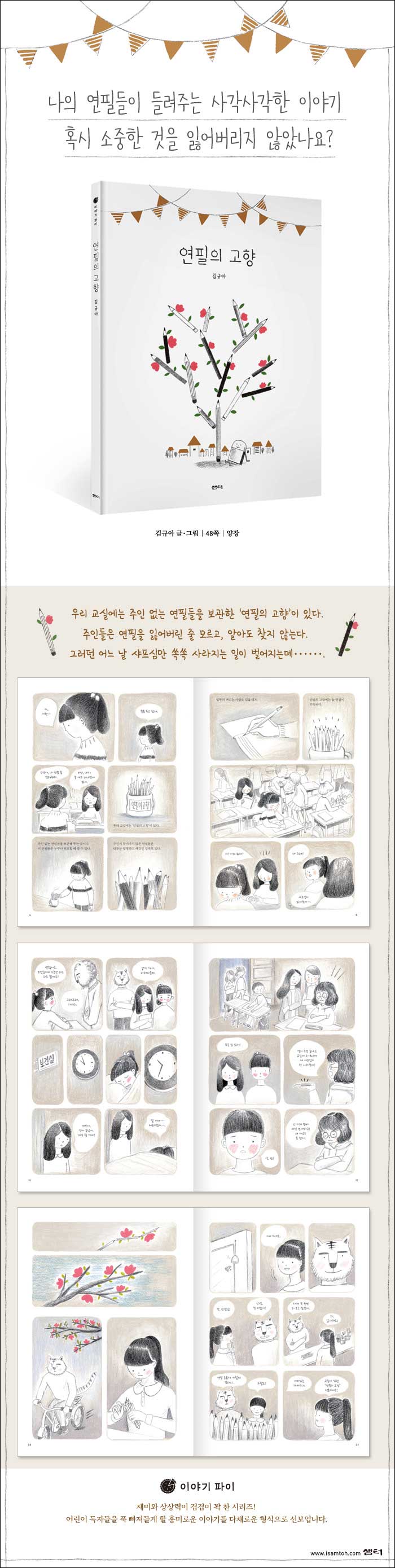∽ 섬세하고 따뜻한 시각으로 포착한, 결코 작지 않은 이야기 독립출판으로 선보인 김규아 작가의《연필의 고향》이 샘터사에서 새롭게 출간됐다. 입소문만으로 어린이 독자들의 사랑을 듬뿍 받은 것은 물론 성인들의 향수를 자극한 작품으로도 주목받았다. 보다 완성도를 높여 소장하고 싶게 재탄생한 《연필의 고향》. 나와 거리가 먼 거대한 사건이 아닌, 일상에서 겪을 법한 경험과 작은 소동을 크고 묵직하게 보여 준다.