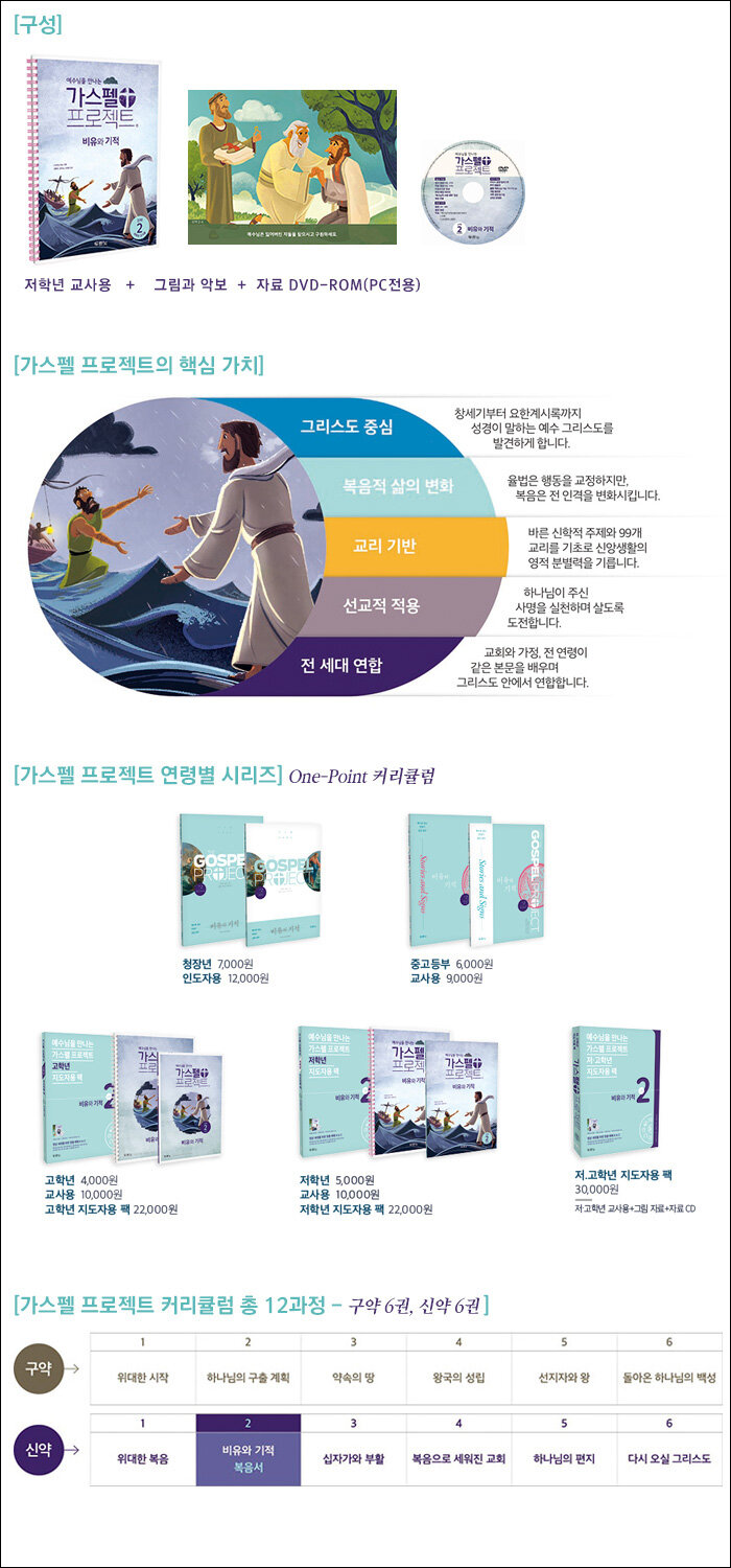 연대기적 흐름에서 “예수 그리스도 중심으로” 성경 66권을 조명하는 3년 과정 성경공부 교재, <가스펠 프로젝트 _ 신약2 비유와 기적>의 초등 저학년 지도자용 패키지이다. 초등학생 눈높이에 맞춘 복음적 교육 목표에 따라 다양한 시청각 자료와 활동 자료를 담았다. 모든 설교는 예수 그리스도와 연결하여 복음 초청으로 이어지며 게임과 퀴즈 코드로 구성한 다양한 활동을 통해 성경의 메시지와 핵심 교리를 익힐 수 있다.