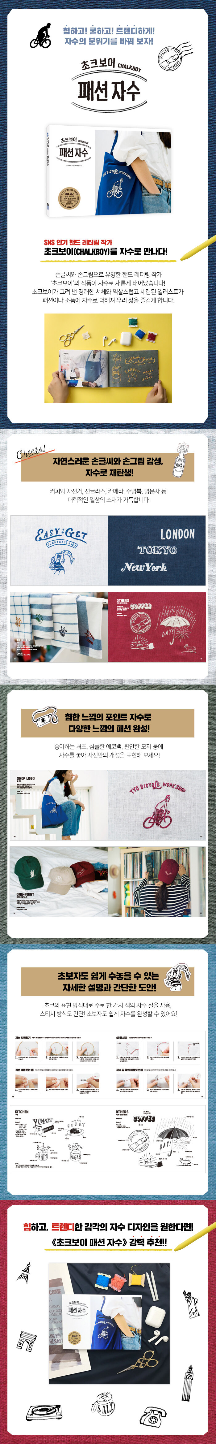 자수의 분위기를 바꿔 보자!초크보이(CHALKBOY)의 매력적인 핸드 레터링이 자수로 재탄생!요즘은 카페와 간판, 광고, 잡지 등 온갖 장소에서 손글씨와 손그림을 볼 수 있다. 칠판에 그리면 ‘초크 그래픽’, 간판이나 창문에 그리면 ‘사인 페인팅(Sign Painting)’, 카드에 쓴 아름다운 서체의 영문은 ‘캘리그라피’ 등이라고 해서 명칭도 가지각색인데, 이것을 두루 일컬어 ‘핸드 레터링’이라고 한다. 핸드 레터링 세계에서 일찍부터 주목을 받은 사람이 바로 초크보이(CHALKBOY)다. 그의 핸드 레터링 작품은 군더더기가 없이 깔끔하면서도 감성이 살아 있고, 사람들의 마음에 와닿는 짧은 메시지와 유쾌한 분위기의 일러스트로 SNS상에서도 늘 ‘좋아요!’가 넘친다. 《초크보이 패션 자수》는 그런 그의 핸드 레터링 작품을 바늘과 실을 통해 자수로 표현한 것이다.