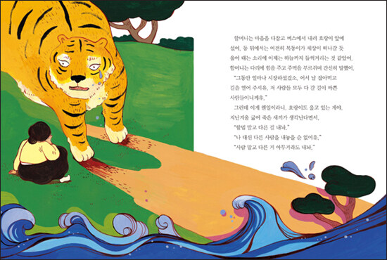 버스를 타고 딸네 집에 가던 할머니는 고갯길에서 만난 호랑이의 밥이 될 위기에 처한다. 그러자 등에 업힌 늦둥이 아들 복동이도 울고, 버스에 타고 있던 사람들도 울고, 어느새 버스 안은 눈물바다가 된다. 사람들의 눈물에 지난겨울 굶어 죽은 새끼가 생각난 호랑이는 할머니를 잡아먹지 않기로 하고, 사람들이 만들어 준 떡을 먹고 휙휙 날아 산속으로 사라진다는 것으로 이야기는 끝이 난다. 하지만 할머니에게 그 이야기를 듣는 아이가 되어 책 속으로 슬며시 끼어든 작가는 ‘호랑이가 할머니를 등에 태우고 버스보다 더 빠르게 할머니를 딸네 집에 데려다 준다’는 내용으로 이야기의 결말을 살짝 틀어 놓는다.
