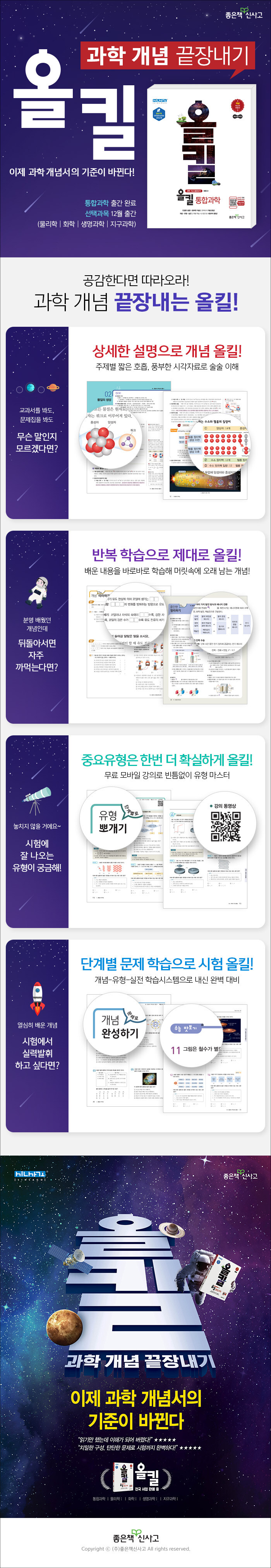 새 교육과정에서 처음으로 등장한 통합과학은 이름 그대로 통합을 강조하고 있습니다. 올킬은 교육과정 내용을 주제별로 나눠서 친절하고 효과적으로 설명하고 다양한 그림과 사진 등 풍부한 자료를 제시하여 쉬우면서도 깊이 있는 개념 학습을 할 수 있도록 하였습니다.