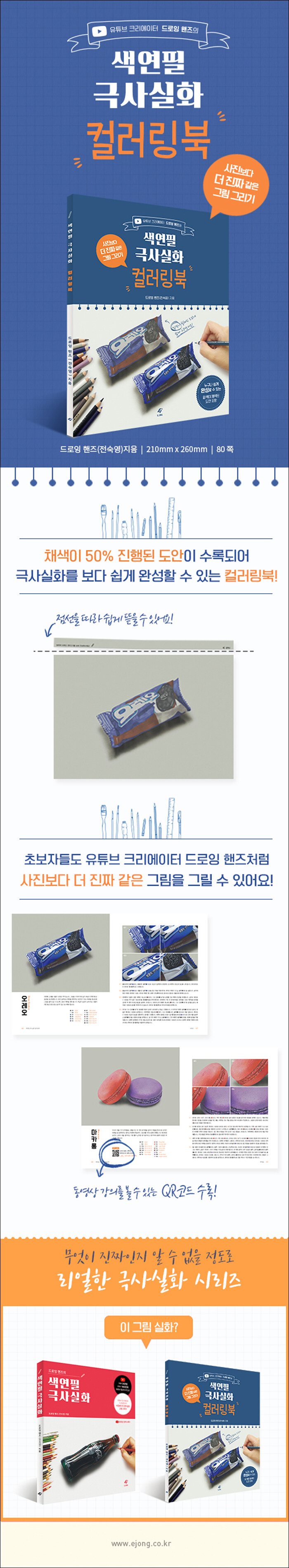 26만 구독자가 사랑한 그림 유튜버 드로잉 핸즈의 그리기 노하우가 집약된 책, <드로잉핸즈의 색연필 극사실화>의 컬러링북이다. 앞쪽에 수록된 회색지 도안은 본책의 ‘채색과정’에 실려 있는 주제 사물들의 도안으로, 밑그림과 에어브러시를 이용한 그림자 표현, 마카를 이용한 밑색 작업 단계까지 완료된 상태이다. 독자들은 별도의 마카나 에어브러시의 구매 및 사용 없이 색연필을 이용해 더욱 쉽고 간편하게 완성도 높은 극사실화를 그려볼 수 있다.