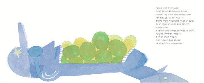 특히 화가는 이번 그림책에서 붓이 빚어내는 부드러운 면과 연필이 만드는 날카로운 선의 차이를 활용해서 장군과 농부의 캐릭터를 매력적으로 형상화했다. 거센 파도와 대포 소리가 쿵쿵 울리는 바다 한가운데에서 뗏목을 탄 장군과 농부를 그린 장면이 대표적이다. 배경은 아크릴릭 물감을 써서 붓으로 천천히 색을 입히고, 인물은 가는 색연필로 만화를 그리듯 경쾌하게 그렸다. 『장군님과 농부』는 밑그림 없이 바로 종이에 그림을 그리는 방식으로 작업해 나온 책이다. 화가 는 종이를 마주하고 붓을 들고 마음에 드는 그림이 나올 때까지 한 점씩 정성을 다해 끊임없이 그리며 아름다운 그림책을 완성해 냈다.