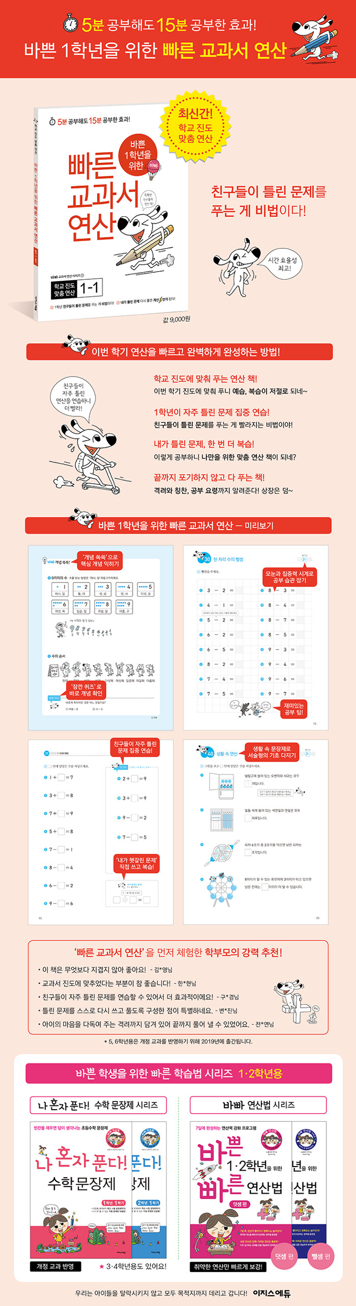 바쁜 1학년을 위한 빠른 교과서 연산 - 1학년 1학기 학교 진도에 맞춰 푸는 연산 책, ‘바쁜 1학년을 위한 빠른 교과서 연산 1-1’(이하 ‘빠른 교과서 연산)’이 나왔다! 이 책은 시간 효율성이 최고다! 이번 학기 연산 중 1학년이 자주 틀린 문제를 집중 연습하여 빠르게 완성하도록 설계했기 때문이다.