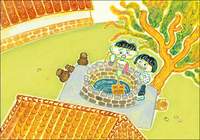 민율이 자랑스러워하면서 두레박을 바라보다가 물을 휙 쏟아 버립니다. 그리고 다시 두레박을 우물에 던져 넣었습니다. 통통 배가 되어 떠다닙니다. 하지만 민율이는 이제 걱정 없습니다. 어떻게 하면 물을 뜰 수 있는지 알기 때문입니다. 두레박을 넣고 꺼내기를 반복, 세 번만에 물을 다시 펐습니다.