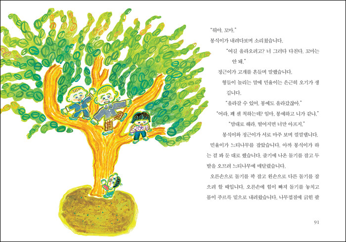 민율이는 아홉 살 꼭지와 봉예와 놀게 되면서 옛날 사람들의 풍속도 자연스레 경험하게 됩니다. 참새 잡기, 우물에서 두레박으로 물 긷기, 나무 타고 오르기 등 옛날 놀이 속의 우리 문화도 절로 알게 됩니다. 할머니 할아버지와 소통하고 친구가 되는 이야기는 세대 간 정이 두터워지는 계기가 될 것입니다. 동심은 아이들만 지닌 것이 아니라 어른들, 할머니 할아버지도 지니고 있어, 끝내 사라지지 않을 순한 마음임을 확인하게 될 것입니다.