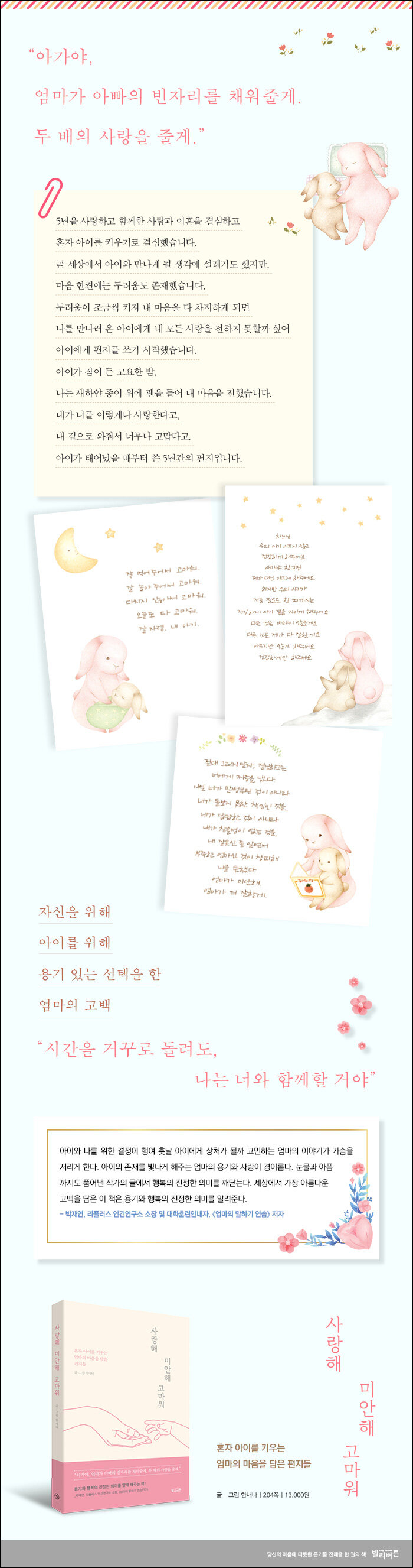 “시간을 거꾸로 돌려도, 나는 너와 함께할 거야”다음 유명 커뮤니티의 육아방의 많은 아기 엄마들의 마음을 흔들고 눈물을 적신 편지가 있다. 아이를 향한 사랑의 세레나데가 담긴 편지 한 장. 아이에게 쓰는 편지는 육아 커뮤니티에서는 아주 특별한 것이 아닐 수도 있다. 그러나 저자가 올린 편지는 특별했다. 저자는 오랜 연애 끝에 결혼을 하고 예쁜 아기 천사의 소식을 들었을 때, 남편과 이혼을 결심한다. 임신을 하고 이혼을 결정하기까지 수천 번 수만 번을 고민했지만, 아이를 위해 자신을 위해 용기를 내기로 했다. ‘혼자 아이를 키우기로 했다.’ 키우면서 많은 어려움이 있을 것을 알고 있지만, 아이를 키우기로 했다. 아이와 함께하는 날들은 믿을 수 없을 만큼 행복했다. 그 순간 행복을 가르고 두려운 마음이 엄습했다. 아이가 커서 물어올 질문, “엄마 나는 왜 아빠가 없어?” 이 물음에 어떻게 대답해줘야 아이가 혼란스럽지 않을까를 고민하면서 매일 밤 아이에게 편지를 썼다. 편지 한 장에는 아이를 향한 엄마의 사랑과 용기를 내어 자신이 원하는 삶을 선택한 한 여성의 용기가 담겨 있다.
