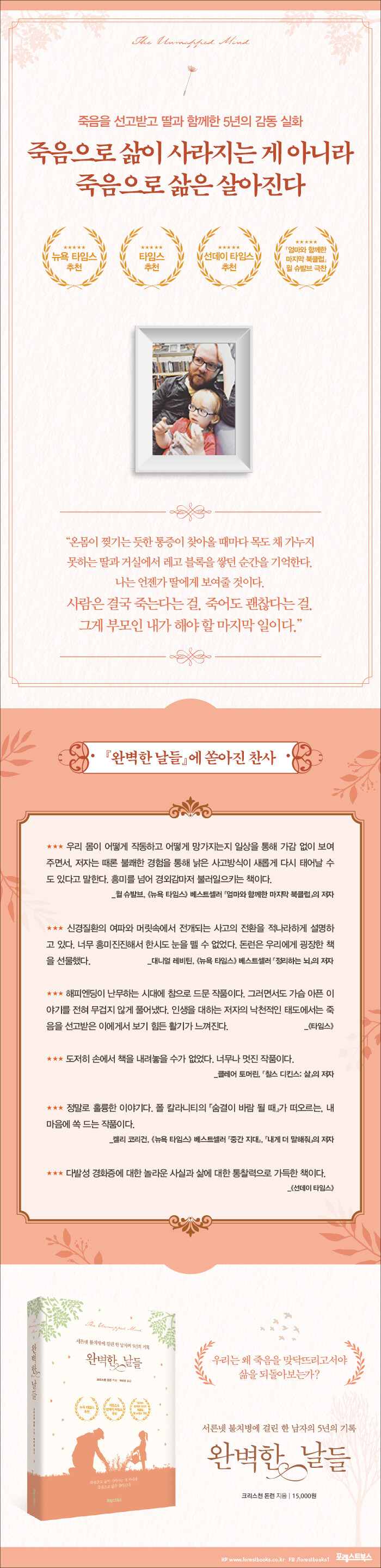 죽음을 선고받고 딸과 함께한 5년의 감동 실화★★★ 해피엔딩이 난무하는 시대에 참으로 드문 작품이다. 그러면서도 가슴 아픈 이야기를 전혀 무겁지 않게 풀어냈다. _《타임스》