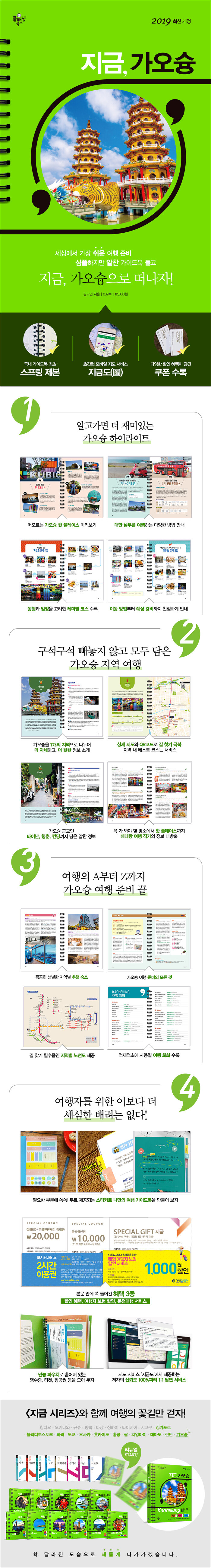 대만의 또 다른 매력 가오슝으로 지금 떠나자!‘대만’ 하면 제일 먼저 떠올리는 곳이 타이베이일 것이다. 그러나 우리나라도 수도 서울과 제2의 수도라 할 수 있는 부산이 관광지로 인기몰이를 하고 있듯이, 대만도 수도 타이베이 못지않게 여행객들의 발길을 유혹하는 곳이 있다. 그곳은 바로 대만 남부에 있는 우리나라 부산과 같은 존재의 가오슝이다. 가오슝은 산을 업고 푸른 바다를 감싸고 있는 항구도시이자 대만 제2의 대도시로 각광받고 있다. 도심 곳곳에 문화 예술의 거리가 형성돼 볼거리가 풍부하며 맛 기행은 보너스일 정도로 먹을 것이 무궁무진하다. 특히 가오슝의 근교인 타이난은 싱싱한 해산물을 저렴한 가격에 맘껏 먹을 수 있는 미식의 도시로 유명하니 대만 남부를 간다면 꼭 들러 보자. 그밖에 항구도시답게 푸른 바다에서 즐기는 해양 액티비티가 다양해 이를 즐기려는 현지인 그리고 여행객들이 늘고 있다. 곳곳이 예술이고 곳곳이 맛집이며 곳곳이 즐길 거리로 가득한 대만 남부의 가오슝 그리고 타이난, 컨딩, 헝춘을 <지금, 가오슝>에서 꼼꼼하게 파헤쳐서 안내하고 있다. 소소한 행복과 소소한 일상을 맛보고 싶은 여행자들은 <지금 가오슝>과 함께 대만 남부로 떠나 보자.