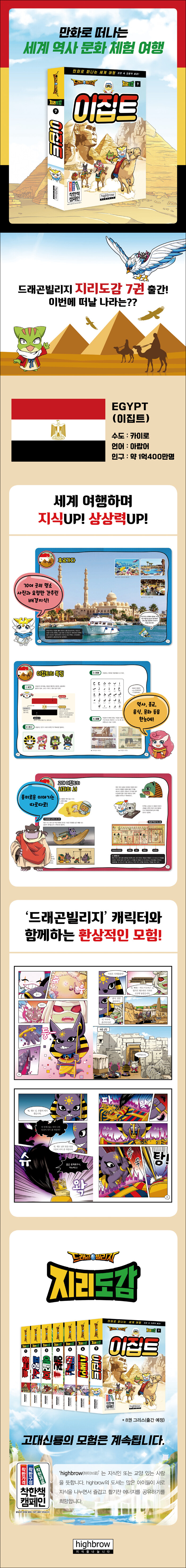 드래곤빌리지 지리도감 7권. 이집트 신화의 어려운 계보를 오시리스의 후손 아몬과 부활한 악의 화신 세트의 대결 스토리로 재미있게 풀어냈다. 그리고 만화 사이사이 람세스 장제전이나 세계 7대 불가사의 피라미드 같은 명소 70여 곳의 사진을 보여 주며 그에 대한 배경지식을 요점만 간추려 쉽게 전달한다.