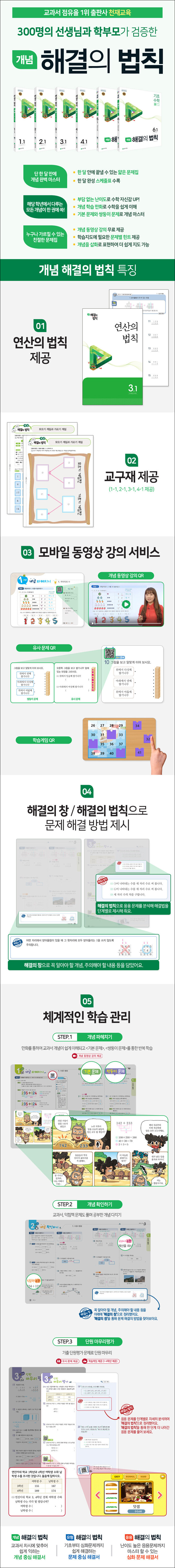 처음 수학을 접할 때나, 기초를 다질 때 쉽고 재미있게 수학의 개념을 익힐 수 있는 개념 중심 해결서다. 핵심 개념들을 교과서 차시별로 이미지화하여 구성하였고, 모바일 코칭 시스템(동영상 강의)으로 수학 개념을 쉽고 재미있게 학습할 수 있다. 또한, 쌍둥이문제와 유사문제로 개념을 한번 더 확실히 다진다.