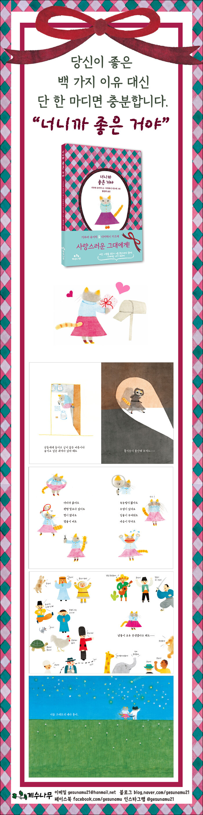 그런데 우리가 정말 원하는 대답이 나를 좋아하는 열 가지, 백 가지 이유일까요? 상대방이 나를 좋아하는 열 가지 이유를 말한다면 우리는 그가 좋아하는 열 가지 모습만을 보여 주기 위해 노력할 것입니다. 때로는 나 자신까지 속이며 스스로의 모습을 꾸며 대겠지요. 하지만 “너니까 좋은 거야.”라는 말에는 이유가 붙지 않습니다. 그저 있는 그대로의 지금 내 모습을 사랑할 뿐이지요. 그래서 “너니까 좋은 거야.”라는 한 마디 문장에는 그 어떤 백 가지 이유보다 커다란 진심이 묻어납니다. 오늘도 나의 마음을 확인하고 싶어 하는 사랑하는 그대에게 말해 주세요. “너니까 좋은 거야.”