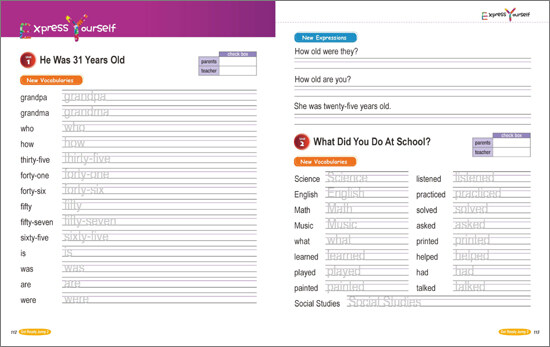 2) Writing Practice Pages(Express Yourself): 매 과의 중심 단어와 표현을 써 볼 수 있는 페이지입니다.