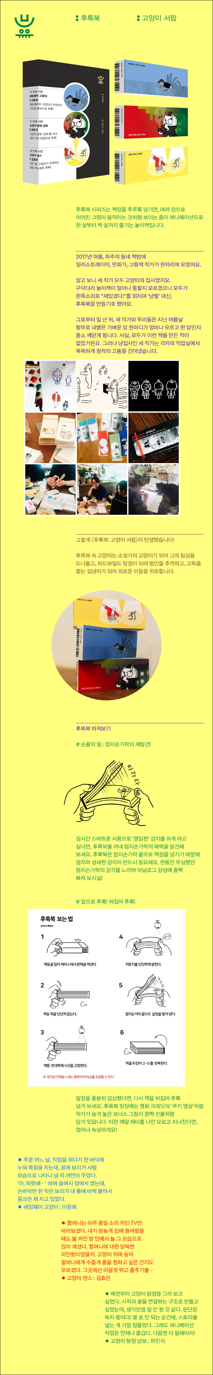 고양이와 책, 단단히 바람이 들었습니다서점의 고양이가 손님의 종아리를 간질이며 스윽 지나갑니다. 책장을 넘기며 일어난 바람이 또다시 손님의 얼굴을 간질입니다. 손님은 생각했습니다. ‘책장의 바람이 고양이와 닮았군!’ 고양이와 책, 작가와 고양이는 그들만 아는 깊은 영혼의 교감을 나누는지도 모르겠습니다.책의 물성을 온전히 느끼는 것도 우리가 살아가는 디지털 세상에서 꽤 재미있는 놀이가 되지 않을까요. 어쩌면 그들의 은밀한 관계를 알게 될지도 모르잖아요. 움직임과 이야기가 담긴 「후룩북 : 고양이 서랍」으로 책의 색다른 경험을 만끽하길 바랍니다. 언제나 고양이처럼, 유유냥냥!