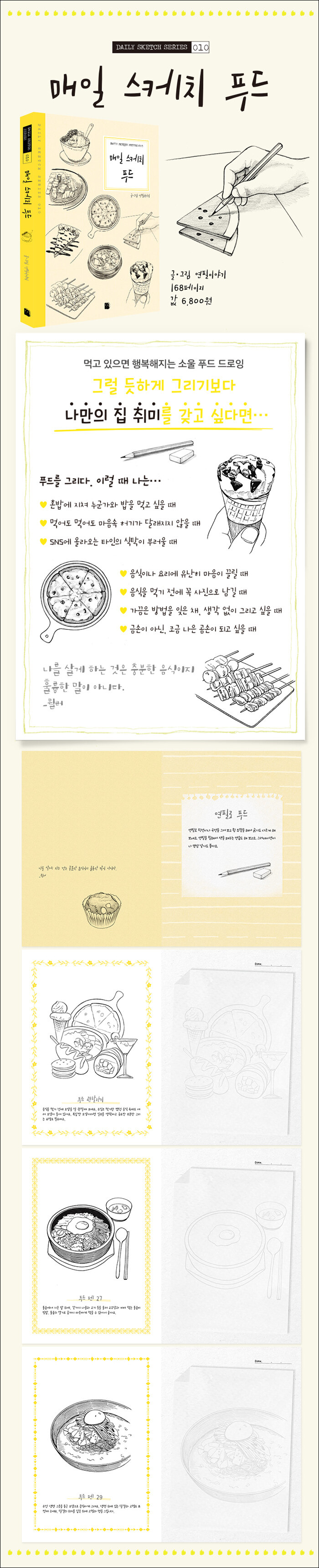 이 책은 저자인 연필이야기가 운영하는 <연필 이야기-드로잉 클래스>에서 수강생들과 함께 연습했던 ‘푸드 스케치’ 드로잉 노하우를 모아 만들어 초보자들이 따라 그리기에 알맞게 구성되어 있다. 아울러 페이지마다 수록된 짧은 코멘트는 마치 화실 선생님이 뒤에 서서 이야기해 주듯, 드로잉할 때 꼭 필요하지만 자꾸만 놓치는 포인트를 디테일하게 잡아 준다.